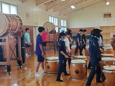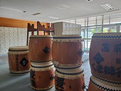 本日は公民館から太鼓を移動して、学校の格技場での太鼓練習です。