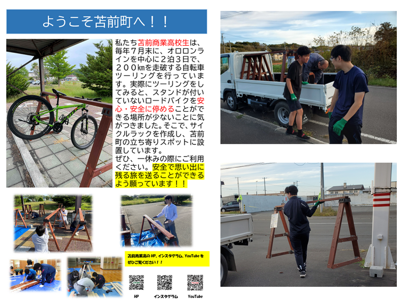 サイクルラックは、本校商業部の生徒が2泊3日で自転車ツーリング事業を実施する中で、留萌管内を訪れる旅行者が多いことと、その際に生徒達がコンビニエンスストアや観光施設で自転車を置くスペースが少ないことに気づいたことをきっかけに、サイクルラックを製作し苫前町の観光スポット等に設置を行い、留萌管内を訪れるツーリストが安心して休憩し、管内の豊かな自然を楽しんでいただくことで、町を活気づけたいという思いで設置しています。