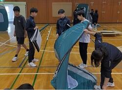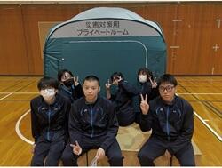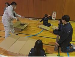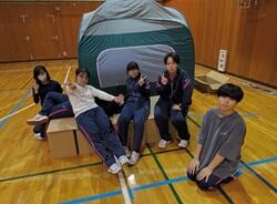午後には、苫前町役場の総務財政課より、震災の恐ろしさと避難訓練の重要性について講話いただいた後、ダンボールベットと簡易テントの設営体験を行いました。初めての設営に手間取るかと思いましたが、説明書を読みながらスムーズに作り上げることができました。