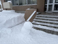 朝、玄関前に行くと、少し傾いた雪だるまがいました。