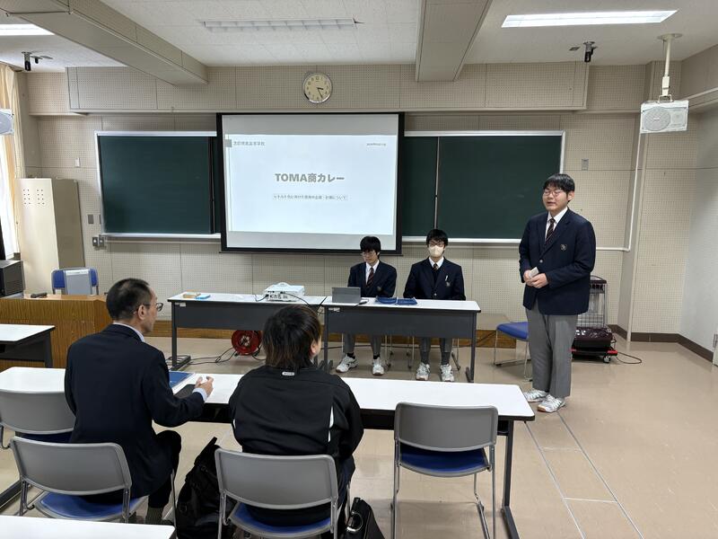 留萌市で生パイの販売やキッチンカーで販売製造業を営んでいる「さんなすび 片岡」様が来校し、3年生の課題研究の授業で、パイやピザのコラボ商品開発で、授業で考案してきた商品のレシピや試作品の発表をさせていただきました。